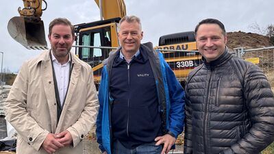 In die Zukunft kommt Bewegung – zunächst vor allem Erdbewegung. Denn für den Bau der neuen Lager- und Logistikhalle müssen 13.000 m³ Erde den Standort auf dem WERO Firmengelände in Taunusstein-Neuhof wechseln. Sie machen Platz für eine 3.000 m² große neue Halle, die den Wirtschaftsstandort Rheingau-Taunus-Kreis nachhaltig stärken wird. Eine Investition in Höhe von rund 10 Millionen Euro ist in unserer Region sehr außergewöhnlich, daher wollten Landrat Sandro Zehner und Taunusteins Bürgermeister Joachim Reimann direkt vor Ort den Baubeginn verfolgen. Wolfram Michallik, Geschäftsführer von WEROs Dachmarke Vality Ventures, führte die beiden über das Firmengelände und die Baustelle.