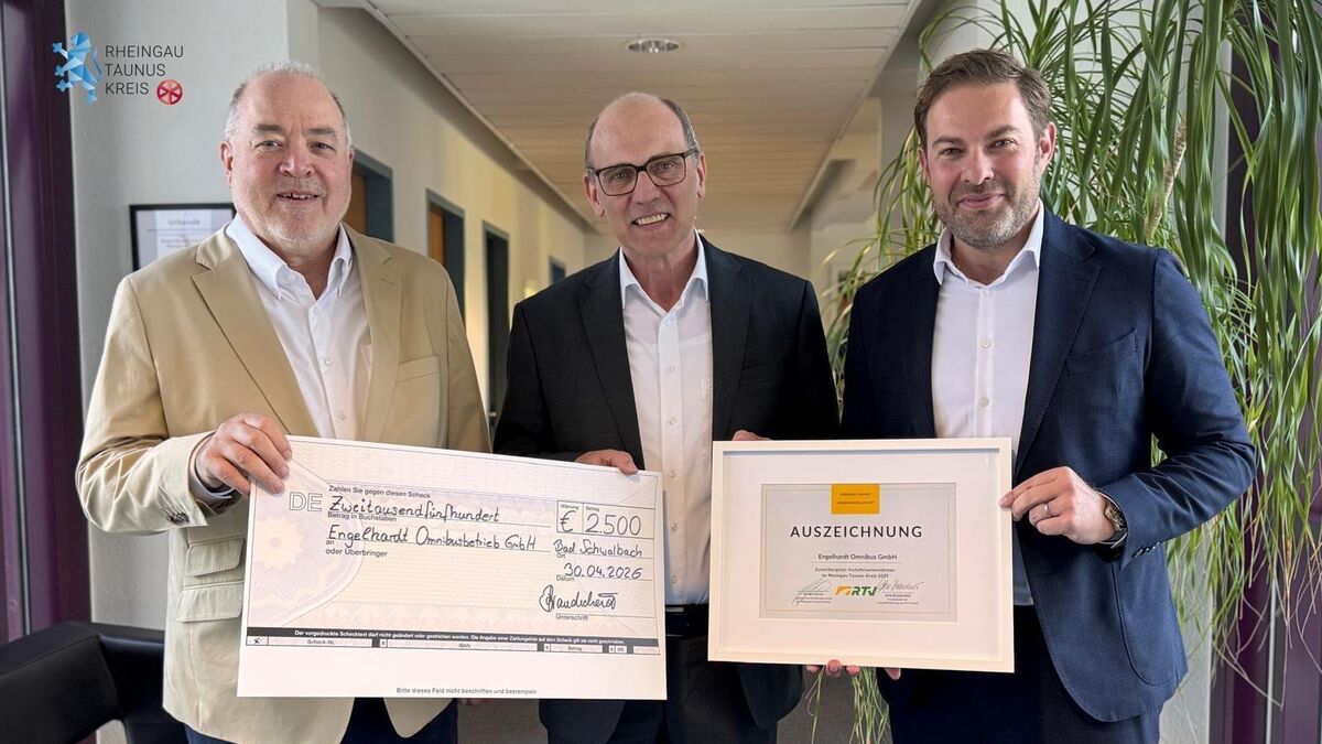 Die Rheingau-Taunus-Verkehrsgesellschaft mbH (RTV) verleiht in diesem Jahr daher erstmals den Preis für das zuverlässigste Verkehrsunternehmen. Dieser Preis ist jetzt von Landrat und Verkehrsdezernent Sandro Zehner und Arno Brandscheid, Vorsitzender der Geschäftsführung der RTV an Frank Engelhardt, Geschäftsführer von Engelhardt Omnibus GmbH aus Heidenrod überreicht worden.