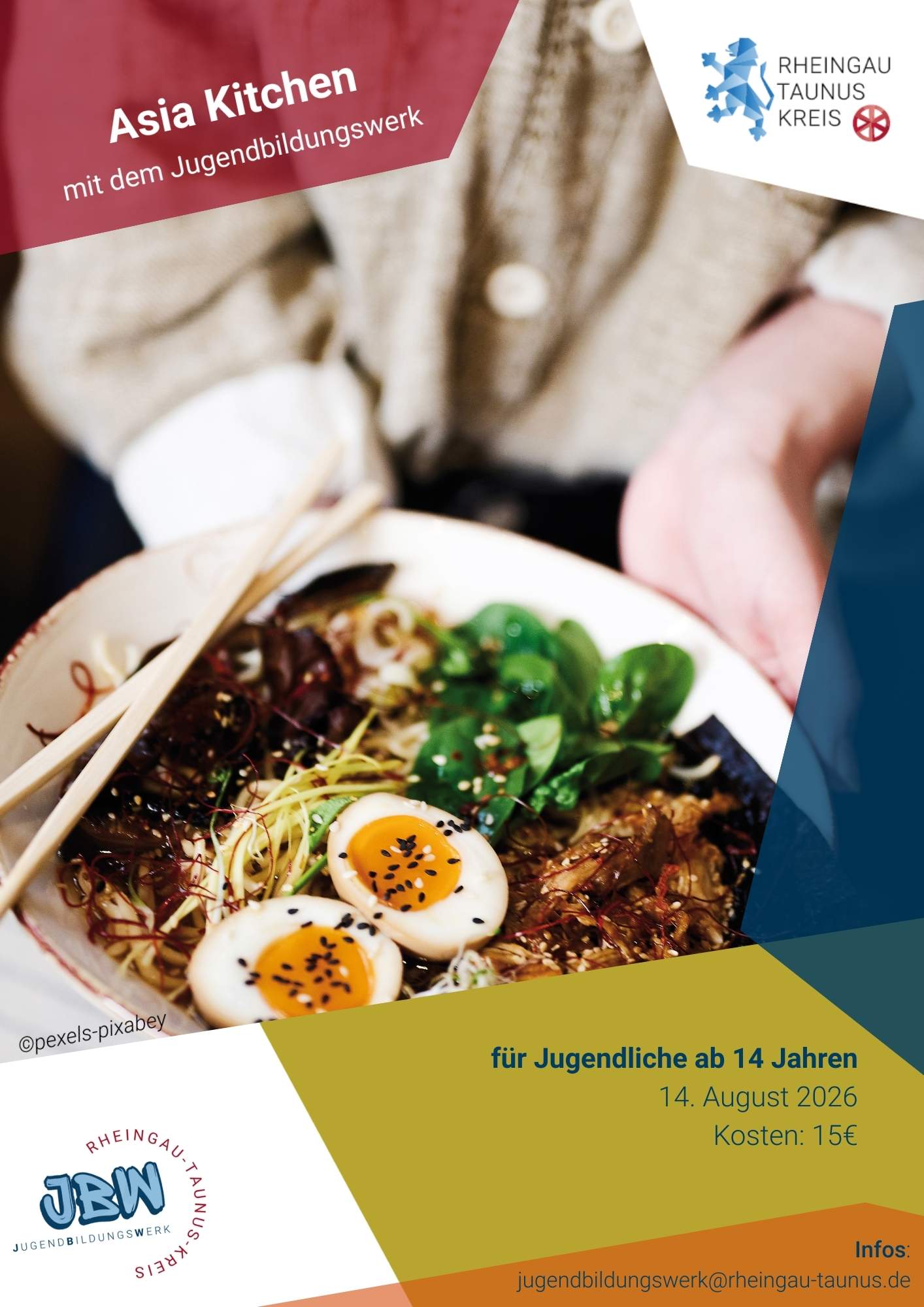 AnmeldungKommt mit auf eine kulinarische Reise durch Asien. In dem Workshop lernt ihr, wie ihr richtig leckere Gerichte aus Japan, Thailand, China und Vietnam zaubert. Frisch, bunt und mega lecker. Wir probieren uns durch die Aromen Asiens und lassen den Nachmittag bei einem gemeinsamen Essen ausklingen. Dieser Workshop gibt euch die perfekte Chance, in einer modernen Kochschule wertvolle Tipps von Profis zu bekommen und eure Kochskills auf das nächste Level zu heben. (Dieses Angebot gilt für Jugendliche ab 14 Jahren aus dem Rheingau-Taunus-Kreis. Kosten 15€)