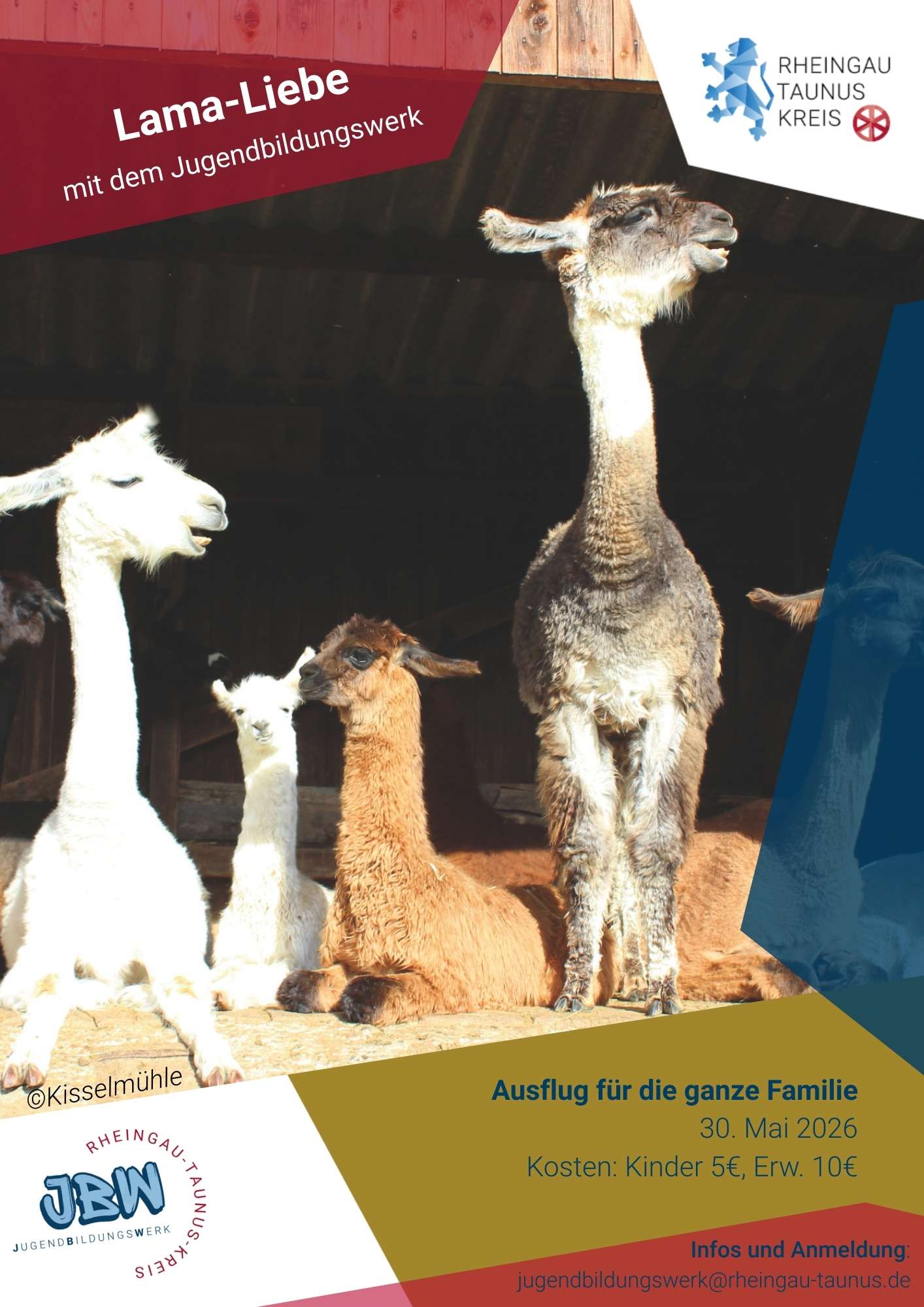 AnmeldungEntflieht dem Alltagstrubel und lasst euch von der ruhigen, charmanten Ausstrahlung der Lamas begeistern. Beim Lama-Trekking erfahrt ihr alles über diese faszinierenden Tiere mit ihrem sanften Blick, von ihrer Lebensweise bis hin zu ihrer Nutzung. Ob beim Streicheln, Füttern oder gemeinsamen Wandern: Achtet auf die magische Wirkung ihrer langbewimperten Kulleraugen. Lama-Liebe ist einzigartig und bleibt unvergesslich. Nach der Tour könnt ihr beim Filzen mit Lamawolle und einem entspannten Picknick inmitten der Natur die Eindrücke in aller Gelassenheit auf euch wirken lassen. (Dieses Angebot gilt für die ganze Familie. Kosten Kind 5€, Erwachsene 10€)