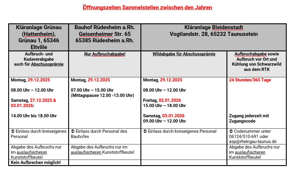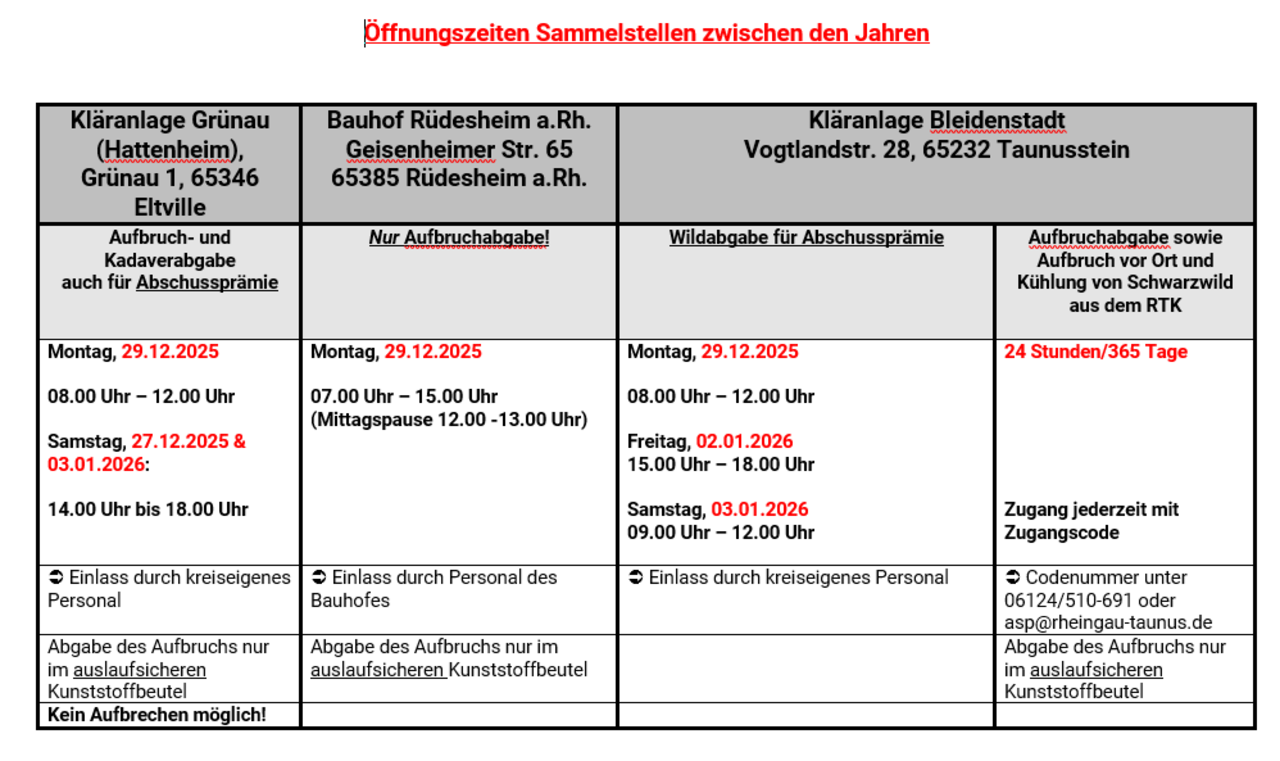 Der Rheingau-Taunus-Kreis hat die geforderte Probenzahl bereits überschritten. Wir bitten daher um Verständnis, dass für das verbleibende Jahr monatlich nur noch max.5 Schweinepest-Monitoring-Proben von außerhalb der Sperrzonen gesund erlegten Wildschweinen eingeschickt werden.